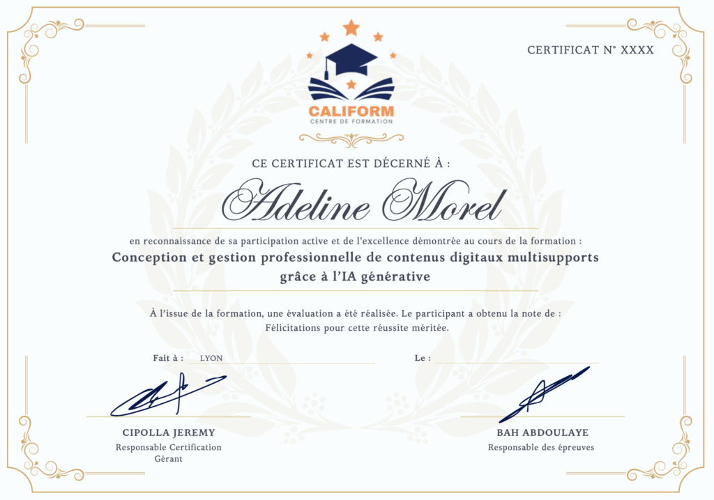 La certification « Conception et gestion professionnelle de contenus digitaux multisupports grâce à l’IA générative » est délivrée à l’issue d’un parcours de formation professionnalisant, destiné à valider les compétences essentielles pour exploiter les outils d’intelligence artificielle générative (ChatGPT, Microsoft Copilot, Google Gemini, Adobe Firefly, etc.) dans un contexte professionnel.