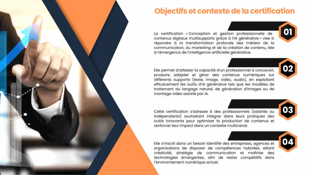 La certification vise à attester un niveau opérationnel avancé dans la mise en œuvre de l’intelligence artificielle générative pour la production de contenus numériques.